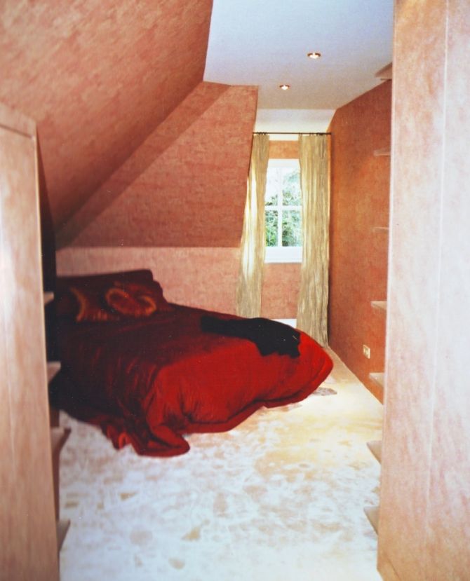 Einbauschrank und Eckborde aus Plexiglas im Ruheraum einer Dame