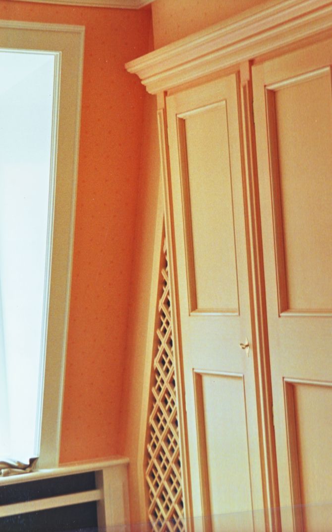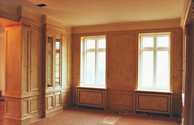 Paneelwand mit Fensterbänken und Heizungsverkleidungen - alles in